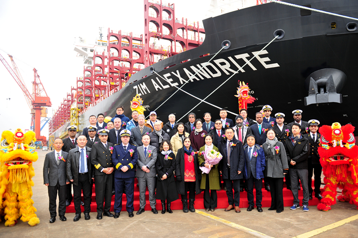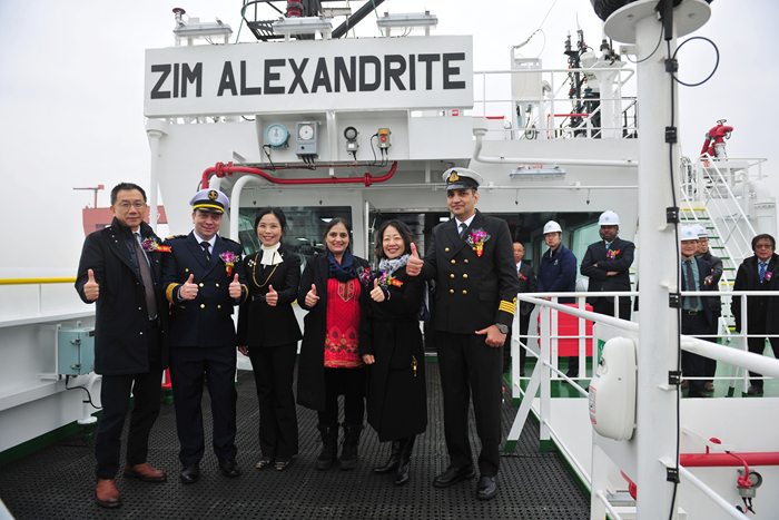 Tracy Hui女士將新船命名為“ZIM ALEXANDRITE”輪,為新船砍纜、擲香檳禮并與嘉賓們登船參觀。汽笛鳴響,祝福新船以及隨船船員航行平安,為船東和租家?guī)順s譽和財富。